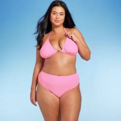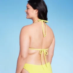 Triangle bikini top from Wild Fable⢠in a solid color with plisse texture. Accented with a butterfly charm on the front. Made of a soft fabric with added spandex. Halter straps with behind-the-neck ties and a slender string with back fastening complete the look.