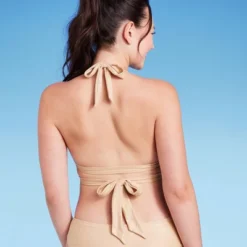 Gold bralette bikini top from Wild Fable⢠tailored in a longline silhouette with a wrap front. Made of stretchy fabric with full lining and comes with removable cups. Back tie and halter straps complete the look with a custom fit.