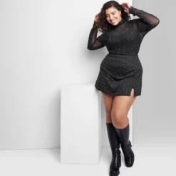Solid-color pullover T-shirt from Wild Fable⢠embellished with sparkly rhinestones. Made from lightweight, very sheer power mesh fabric with spandex for comfortable wear that moves with you. Tailored in a slim-fit silhouette with a mock turtleneck, long sleeves and raw edges for additional flair.