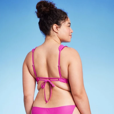 Purple longline bikini top from Wild Fable⢠featuring smocked detailing. Ruffled trim along the neck and hem completes the look. Soft and stretchy fabric offers comfortable wear. Back tie and drawstring help provide a secure fit, while D/DD features fully adjustable x-back and tie closure. Removable cups provide customizable coverage.