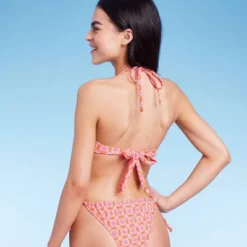 Orange bikini top from Wild Fable⢠features a deep U neckline. Covered with tile print, and made with soft and stretchy fabric for comfortable wear. Back tie with halter straps helps keep the top secure. Strappy design gives you multiple options for styling. Removable cups provide customizable coverage.
